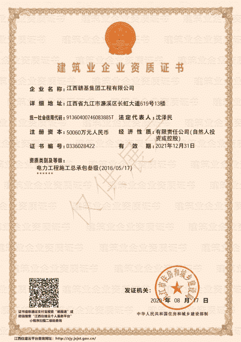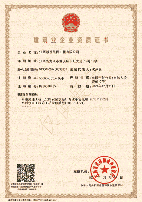 江西贛基集團工程有限公司是國家壹級施工總承包企業,具有公路工程、市政公用工程、房屋建筑工程總承包壹級資質;公路路基、路面專業壹級;水利水電工程、電力工程、城市園林綠化、公路養護工程貳級資質。
